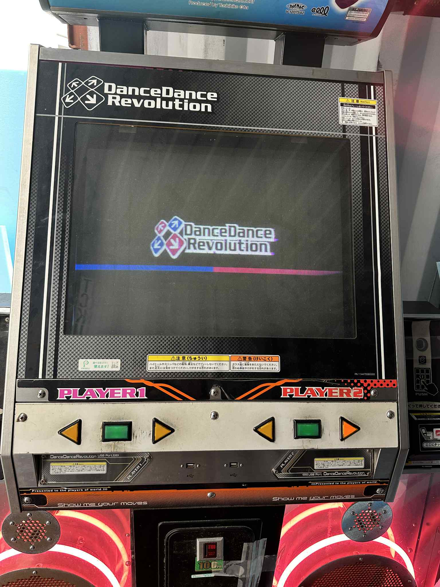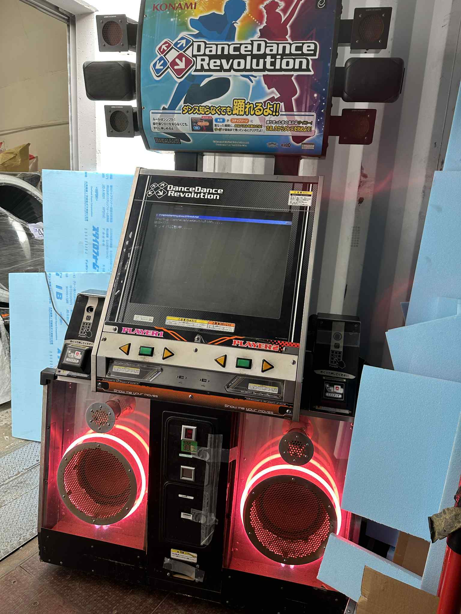 A 1st gen DDR, originally made for 1stMIX through Extreme. They are the oldest DDR cabinets you can find. This cabinet has a very good monitor in comparison to most, but a lot of wear. Notably, the sub speaker grills have a lot of rust. It is running the original bemaniPC, it is not upgraded to the newer 6291 board. This hardware is designed to run DDR X through A3. Pads will absolutely need a full strip/clean and service. It is coming off an old location in Japan, expect the condition to reflect that.